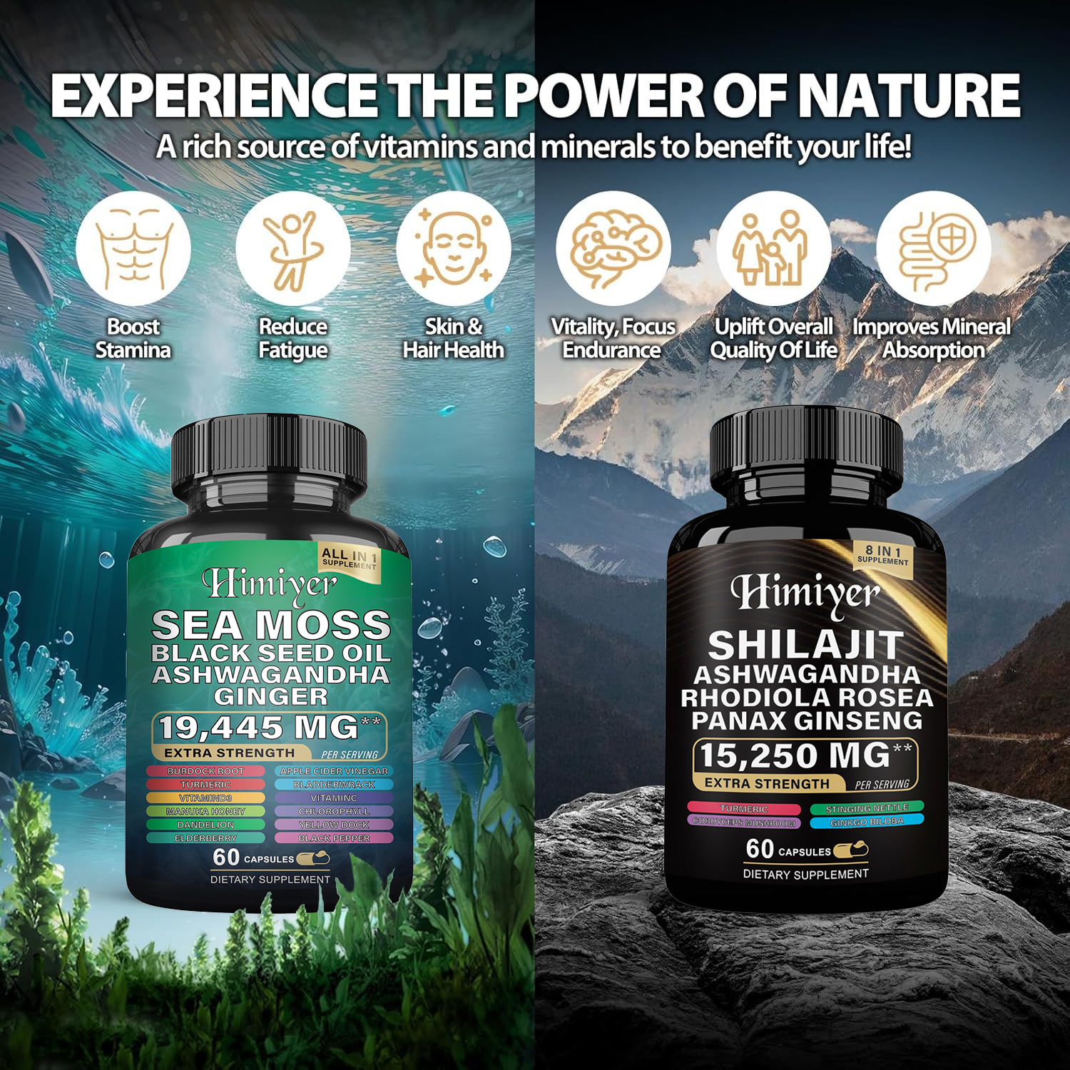 Vitamin C, vitamin D3, sea moss powder, black seed, ashwagandha, turmeric, bladderwrack, burdock, apple cider vinegar powder, manuka honey, black pepper, chlorophyll, shilajit extract, rhodiola rosea, ginseng, cordyceps mushroom, ginko biloba.